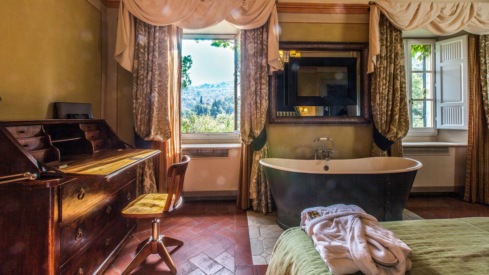 The Montefioralle double is easily one of everyone’s favourites in the hotel. Its two windows overlook the villa’s Italian garden, and offer stunning views of the hills of Montefili and Montefioralle – they are, in fact, the best views of any room in our small hotel.